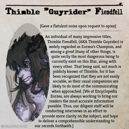 Thimble grew up as a clawing animal trapped in the husk of a Coerthan Pastor’s daughter named Thraine Ichoran Indrenoux. In actuality, Thimble was born intersex (along with a few other defects from being half wyrmkin) but was assigned female to Halonian standards and lived their childhood out thinking he was simply a deformed woman. Thimble remembers very little of their early life, and whatever scraps of memory he’s retained tells him that’s probably for the best. Spending his life in service to his father was brutal and by the time they are nearing the end of adolescence, Pastor Indrenoux insists his child become a Friar in service to The Order, despite having little to no contact with the outside world up until this point. Friar Thraine is slowly somewhat socialized and serves a unit of temple knights for three years before he is forced to return to his father under order to receive the rest of his training from him. Thimble comes to the conclusion that there is but one way out. He’s always had to carve out spaces for himself in the world and this would be no different. One night he does not come home from his hunting route on the borders of Coerthas. Pastor Indrenoux finds his lost lamb in a sizable stark blot of blood so dark it could be ink against the white snow. The space Thimble has carved for himself this time, lies in a gaping wound, between the open ribcage of an Aevis. Indrenoux watches his own spawn clutch the still twitching organ from the wyrm’s sternum and bite. Drinking deeply from sin, white as snow is washed red in holy vengeance, drenched in righteous fury… and there is no longer anywhere left for a man of Her word to hide.